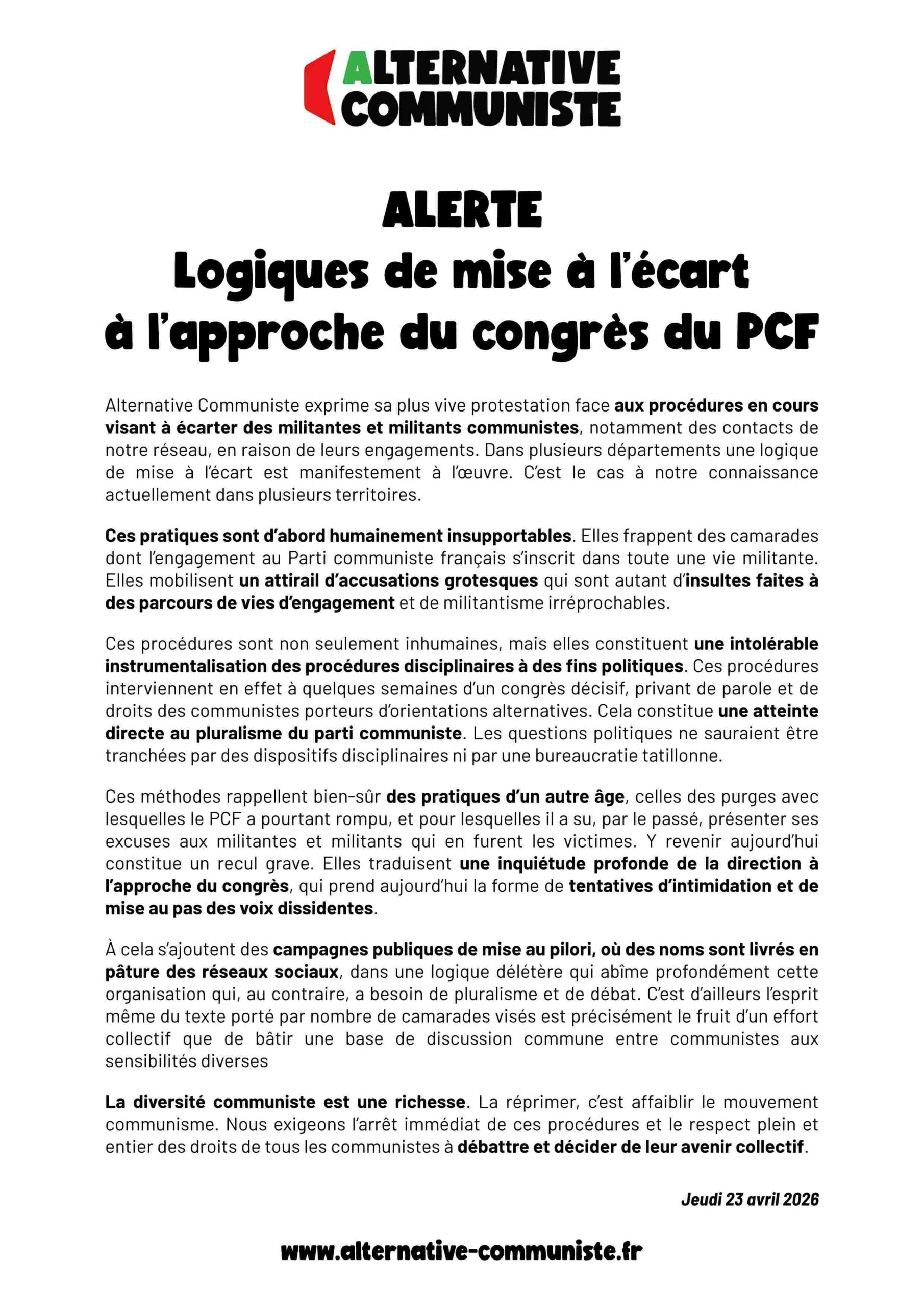 La diversité communiste est une richesse. La réprimer, c’est affaiblir le mouvement communisme. Nous exigeons l’arrêt immédiat de ces procédures et le respect plein et entier des droits de tous les communistes à débattre et décider de leur avenir collectif.